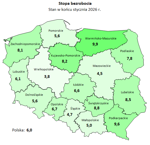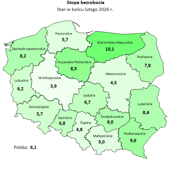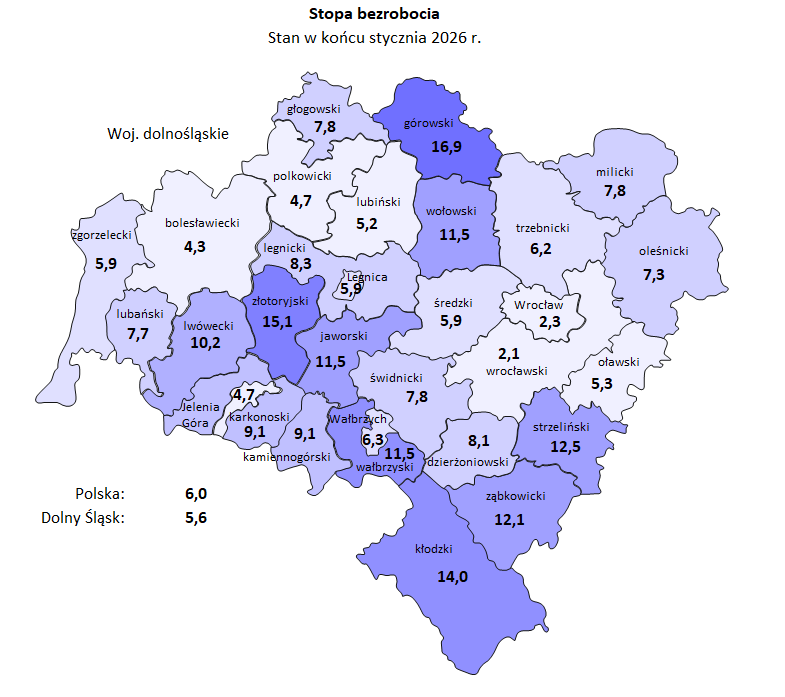 Na koniec lutego 2026 roku w rejestrach powiatowych urzędów pracy województwa dolnośląskiego zarejestrowano 69 166 osób bezrobotnych, z czego kobiety stanowiły 49,4% tej grupy. Pracodawcy z regionu zgłosili 2408 wolnych miejsc pracy, co oznacza, że na jedno miejsce przypadało średnio 3,2 nowo zarejestrowanego bezrobotnego. Stopa bezrobocia rejestrowanego w województwie dolnośląskim wyniosła 5,7%, pozostając niższa od średniej krajowej, która osiągnęła poziom 6,1%.