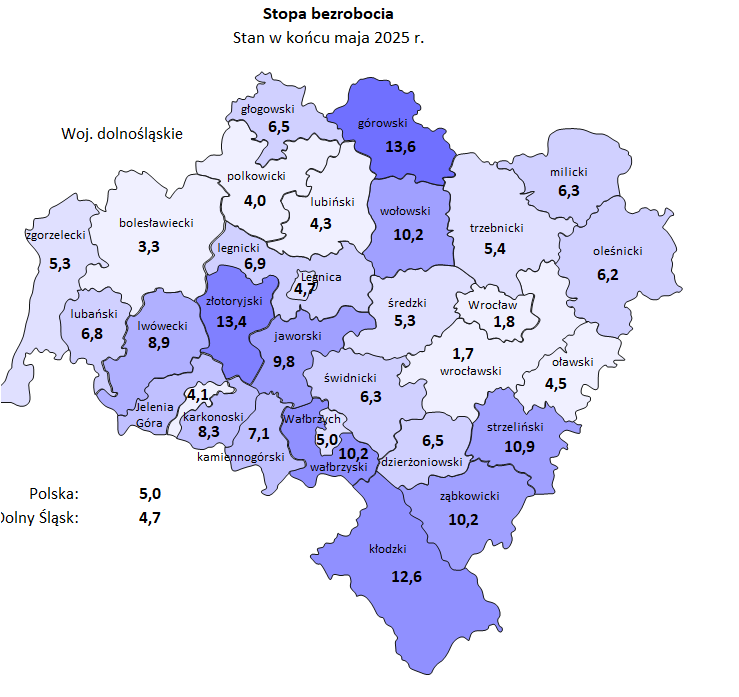 W końcu stycznia 2025 w ewidencji powiatowych urzędów pracy województwa dolnośląskiego odnotowano 59 154 osoby bezrobotne. W okresie sprawozdawczym liczba bezrobotnych będących w szczególnej sytuacji na rynku pracy wyniosła 45 939 osób. Pracodawcy zgłosili do powiatowych urzędów pracy 5 818 miejsc pracy i aktywizacji zawodowej, tj. blisko 24% ofert więcej niż w grudniu 2024. Na 1 zgłoszone wolne miejsce pracy przypadało przeciętnie 1,6 nowo zarejestrowanego bezrobotnego. Według GUS stopa bezrobocia rejestrowanego w województwie dolnośląskim wyniosła 5% i wzrosła o 0,4 punktu procentowego w stosunku do poprzedniego miesiąca. W kraju wskaźnik bezrobocia kształtuje się na poziomie 5,4% i wzrósł o 0,3 punktu procentowego w porównaniu do poprzedniego miesiąca.