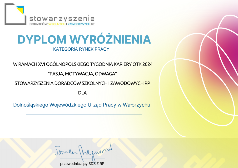 Z radością informujemy, że Dolnośląski Wojewódzki Urząd Pracy został uhonorowany Dyplomem Wyróżnienia w kategorii "Rynek Pracy" przez Stowarzyszenie Doradców Szkolnych i Zawodowych RP!